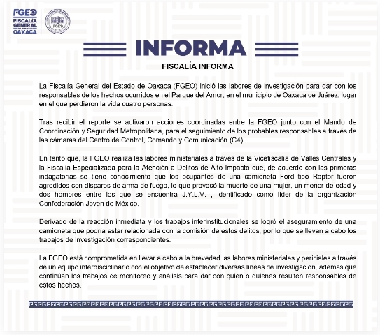 Sobre los hechos, la Fiscalía General del Estado de Oaxaca emitió un comunicado de prensa.