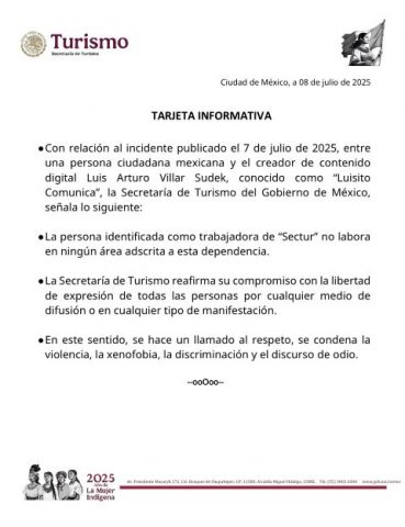 •Con relación al incidente publicado el 7 de julio de 2025, entre una persona ciudadana mexicana y el creador de contenido digital Luis Arturo Villar Sudek, conocido como «Luisito Comunica», la Secretaría de Turismo del Gobierno de México, señala lo siguiente: