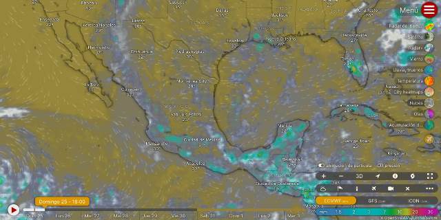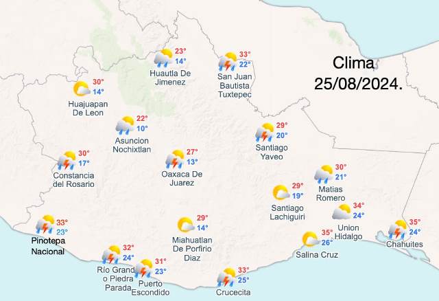 Para el Pacífico Sur cielo nublado durante el día. Por la mañana ambiente fresco en la región y templado en costas con nieblas en zonas altas. Durante la tarde, ambiente cálido con lluvias puntuales intensas en Oaxaca y Chiapas, y fuertes en Guerrero; todas con descargas eléctricas y posible caída de granizo, estas lluvias podrían reducir la visibilidad, ocasionar inundaciones, encharcamientos y deslaves, así como incrementar los niveles de ríos y arroyos. Viento de dirección variable de 10 a 25 km/h en la región, con rachas de 40 a 60 km/h en Chiapas e istmo y golfo de Tehuantepec.