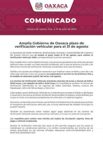 El gobierno del estado de Oaxaca, a través de un comunicado informó que amplía el plazo de verificación vehicular para el 31 de agosto, para quienes no han realizado el trámite correspondiente al primer semestre de 2025.