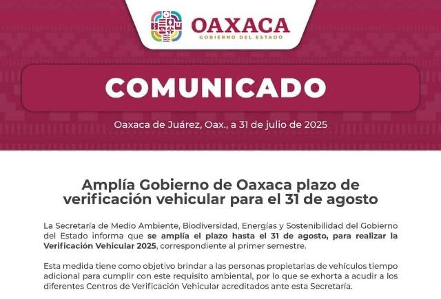 El gobierno del estado de Oaxaca, a través de un comunicado informó que amplía el plazo de verificación vehicular para el 31 de agosto, para quienes no han realizado el trámite correspondiente al primer semestre de 2025.