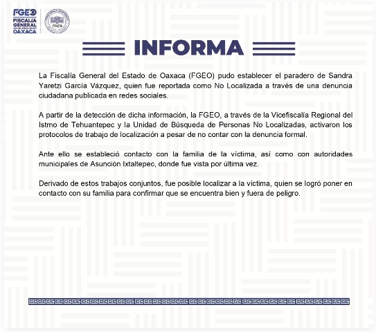 La Fiscalía General del Estado de Oaxaca (FGEO) pudo establecer el paradero de Sandra Yaretzi García Vázquez, quien fue reportada como No Localizada a través de una denuncia ciudadana publicada en redes sociales.