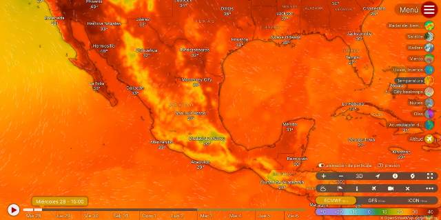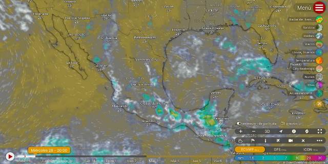 Para hoy, El ingreso de aire húmedo del golfo de México y océano Pacífico, en combinación con inestabilidad en niveles altos de la atmósfera situada sobre el centro y oriente del territorio, generarán lluvias puntuales intensas en Guerrero; puntuales muy fuertes en Veracruz, Oaxaca, Puebla, Morelos, Estado de México y Ciudad de México. Asimismo, la entrada de aire húmedo del mar Caribe y un canal de baja presión en el sureste de México, propiciarán lluvias puntuales fuertes en Chiapas, así como lluvias con intervalos de chubascos en Quintana Roo, Yucatán, Campeche y Tabasco, con fuertes rachas de viento en zonas de Yucatán y Chiapas. Temperaturas máximas de 35 a 40°C en Baja California Sur, Sinaloa, Chihuahua (noreste), Coahuila, Nuevo León, Oaxaca (sureste), Tamaulipas, Tabasco, Campeche, Yucatán y Quintana Roo.
