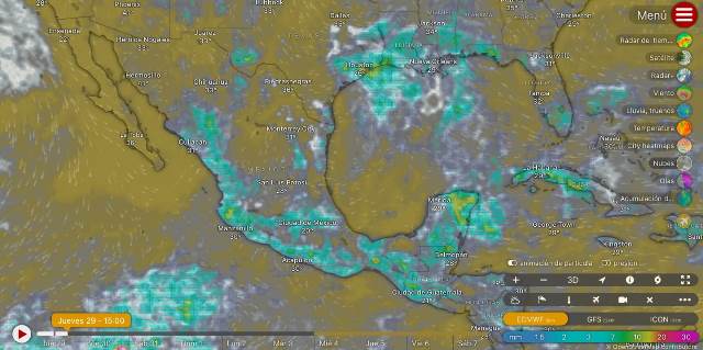 Para el Pacífico Sur cielo nublado durante el día. Por la mañana, ambiente fresco con bancos de niebla en la región. Por la tarde ambiente cálido, con lluvias puntuales intensas en Guerrero, Oaxaca y Chiapas; todas con descargas eléctricas y posible caída de granizo, además, podrían reducir la visibilidad, ocasionar inundaciones, encharcamientos y deslaves, así como incrementar los niveles de ríos y arroyos. Viento de dirección variable de 10 a 25 km/h, con rachas de hasta 40 km/h en zonas de tormenta.