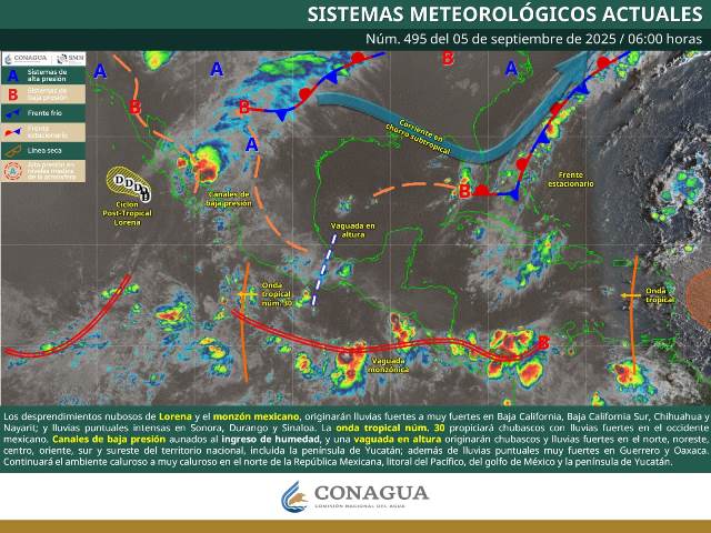 Este día, los desprendimientos nubosos de Lorena continuarán interactuando con el monzón mexicano, originando lluvias fuertes a muy fuertes en Baja California, Baja California Sur, Chihuahua y Nayarit; además de lluvias puntuales intensas en Sonora, Durango y Sinaloa. A su vez, la onda tropical núm. 30 se extenderá sobre el occidente mexicano y propiciará chubascos con lluvias fuertes en citada región. Canales de baja presión en el interior del país, aunados al ingreso de humedad procedente de ambos océanos y una vaguada en altura sobre el oriente y sureste del país, originarán chubascos y lluvias fuertes en el norte, noreste, centro, oriente, sur y sureste del territorio nacional, incluida la península de Yucatán; así como lluvias puntuales muy fuertes en Guerrero y Oaxaca. Todas las lluvias con descargas eléctricas y posible caída de granizo. Finalmente, continuará el ambiente caluroso a muy caluroso en el norte de la República Mexicana, litoral del Pacífico, del golfo de México y península de Yucatán, con temperaturas que podrían superar los 40 °C en zonas de Nuevo León y Tamaulipas.