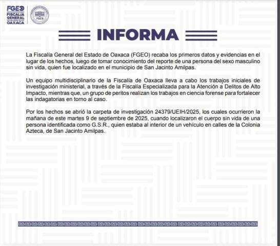 Por los hechos se abrió la carpeta de investigación 24379/UEIH/2025, los cuales ocurrieron la mañana de este martes 9 de septiembre de 2025, cuando localizaron el cuerpo sin vida de una persona identificada como G.S.R., quien estaba al interior de un vehículo en calles de la Colonia Azteca, de San Jacinto Amilpas.