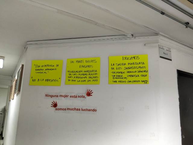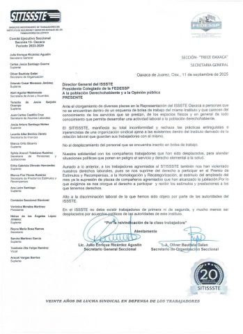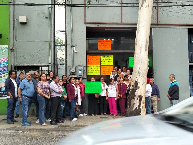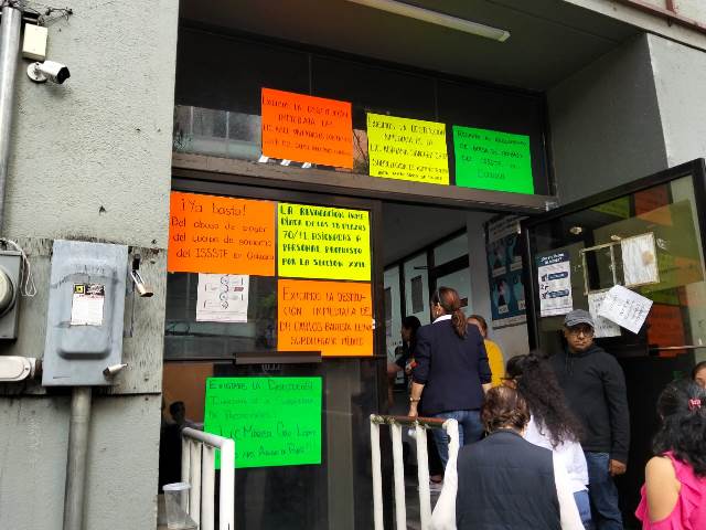 Trabajadores del ISSSTE protestan con el cierre de sus oficinas ubicadas en la calle de Gardenias y amapolas en la colonia Reforma, esto en exigencia para que revoquen la asignación de 17 plazas laborales entregadas a la Sección 22 que califican de irregular.