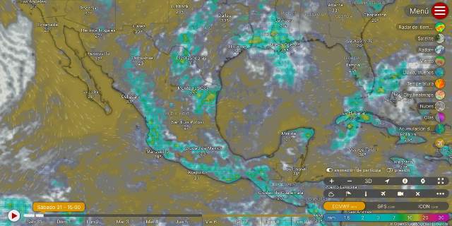 Para el Pacífico Sur por la mañana, cielo medio nublado a nublado con ambiente fresco en la región; templado en zonas costeras. Bancos de niebla en zonas serranas y lluvias aisladas en zonas de Guerrero, Oaxaca y Chiapas. Durante la tarde ambiente templado a cálido; caluroso en el sureste de Oaxaca. Cielo nublado con lluvias muy fuertes a puntuales intensas en Guerrero, Oaxaca y Chiapas; todas con descargas eléctricas y posible caída de granizo, las cuales podrían reducir la visibilidad, ocasionar inundaciones, encharcamientos y deslaves, así como incrementar los niveles de ríos y arroyos. Viento de dirección variable de 10 a 25 km/h con rachas de 40 a 60 km/h en la región.