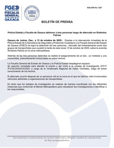 Gracias a la intervención inmediata de la Policía Estatal de la Secretaría de Seguridad y Protección Ciudadana y la Fiscalía General del Estado de Oaxaca (FGEO) se logró la detención de tres personas, derivado del enfrentamiento entre dos grupos de transportistas que sucedió la tarde de este lunes 13 de octubre de 2025, sobre la avenida Símbolos Patrios en la zona metropolitana.