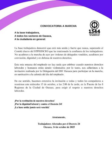 En sustitución a la calenda del día del empleado trabajador de STPEIDCEO marcharan para exigir respeto a sus derechos laborales y humanos ya que están siendo violentados.