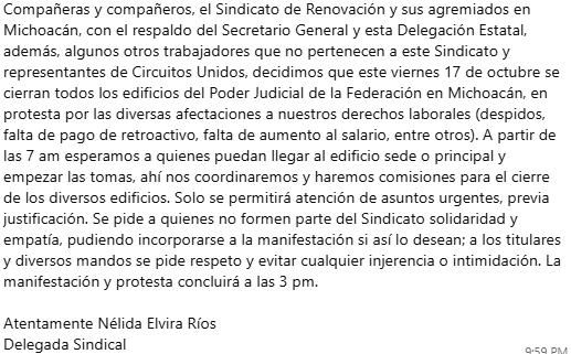 Adicionalmente, a esta manifestación se unieron trabajadores de otros órganos del Poder Judicial Federal a nivel nacional, atendiendo la convocatoria que de igual forma se lanzó entre ellos.