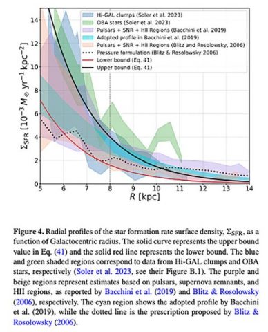 Con esos tres ingredientes, los científicos calcularon el peso del gas interestelar, el cual define la presión en el disco de la galaxia. “También utilizamos las mediciones existentes de oxígeno e hidrógeno que hay en el disco de nuestra galaxia, que son indicadores de las abundancias químicas, y así calculamos la formación de gas molecular a lo largo del disco galáctico con un modelo desarrollado con física fundamental”, agregó.