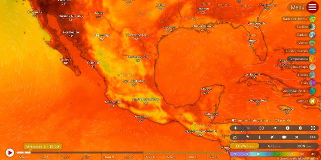 Este día, canales de baja presión extendidos sobre el norte, centro y el sureste mexicano, aunado al ingreso de humedad del océano Pacífico, golfo de México y mar Caribe, generarán lluvias fuertes a muy fuertes, descargas eléctricas, rachas de viento y posibles granizadas en el oriente, centro, sur y sureste del país, incluidos el Valle de México y la península de Yucatán, así como lluvias puntuales intensas en zonas de Oaxaca, Chiapas y Veracruz. Temperaturas máximas de 35 a 40°C en Sinaloa, Tamaulipas, Veracruz, Michoacán, Guerrero, Morelos, Oaxaca, Chiapas, Tabasco, Campeche y Yucatán.