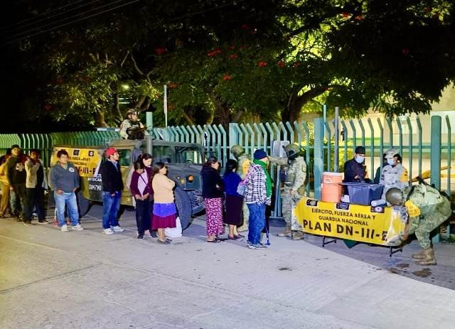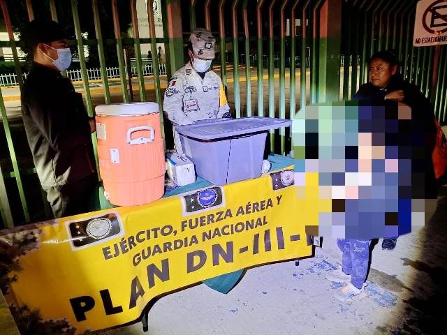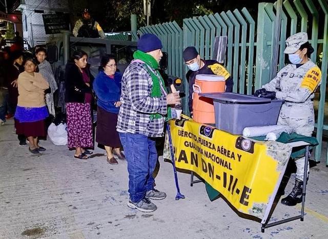 Elementos de la SEDENA, adscritos al 6/o. Batallón de Infantería reparte café a inmediaciones del IMSS-Bienestar de este municipio ante onda gélida.