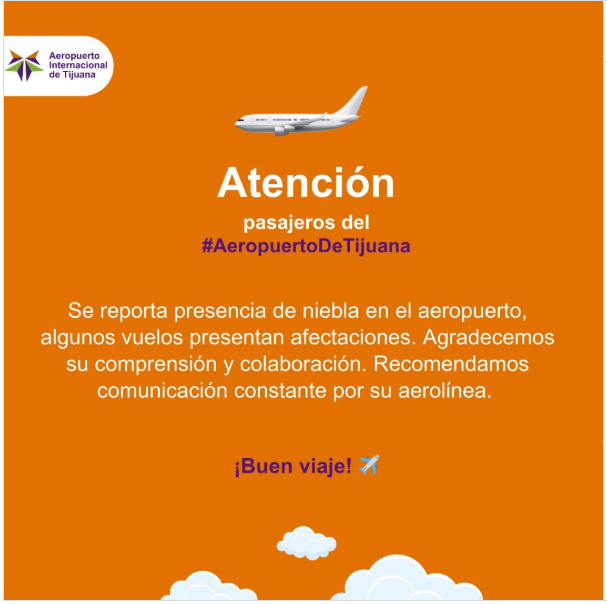 Se recomienda a los usuarios con vuelos programados desde o hacia Tijuana para hoy y los próximos días que se mantengan en contacto directo con su aerolínea para verificar el estatus de su vuelo antes de dirigirse al aeropuerto.