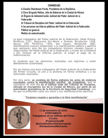 Después de manifestarse frente a las instalaciones ubicadas sobre Insurgentes, arribó al lugar un grupo de elementos de seguridad pública con equipo antimotines, para proceder a desalojar la manifestación de ex juzgadores que exigen respeto a sus derechos adquiridos para la indemnización de ley, y que fue plasmada dentro de la reforma al poder judicial federal.