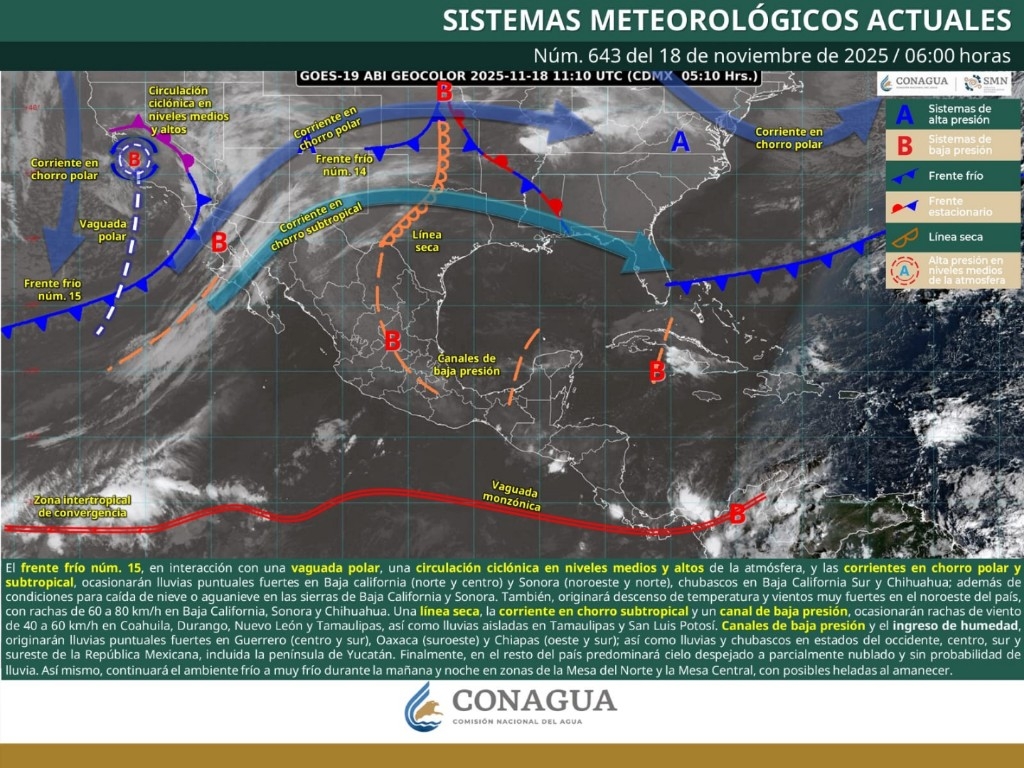 Este día, el frente frío núm. 15 se desplazará sobre el noroeste del territorio nacional, y en interacción con una vaguada polar, una circulación ciclónica en niveles medios y altos de la atmósfera, y las corrientes en chorro polar y subtropical, ocasionará lluvias puntuales fuertes en Baja california (norte y centro) y Sonora (noroeste y norte), chubascos en Baja California Sur y Chihuahua; además de condiciones para caída de nieve o aguanieve en las sierras de Baja California y Sonora. También, originará descenso de temperatura y vientos muy fuertes en el noroeste del país, con rachas de 60 a 80 km/h en Baja California, Sonora y Chihuahua. Por otra parte, una línea seca sobre Coahuila, en interacción con la corriente en chorro subtropical y un canal de baja presión, ocasionarán rachas de viento de 40 a 60 km/h en Coahuila, Durango, Nuevo León y Tamaulipas, así como lluvias aisladas en Tamaulipas y San Luis Potosí. Canales de baja presión sobre el interior y el sureste del territorio nacional, en combinación con el ingreso de humedad del océano Pacífico, golfo de México y mar Caribe, originarán lluvias puntuales fuertes en Guerrero (centro y sur), Oaxaca (suroeste) y Chiapas (oeste y sur); así como lluvias y chubascos en estados del occidente, centro, sur y sureste de la República Mexicana, incluida la península de Yucatán. Finalmente, en el resto del país predominará cielo despejado a parcialmente nublado y sin probabilidad de lluvia. Así mismo, continuará el ambiente frío a muy frío durante la mañana y noche en zonas de la Mesa del Norte y la Mesa Central, con posibles heladas al amanecer.