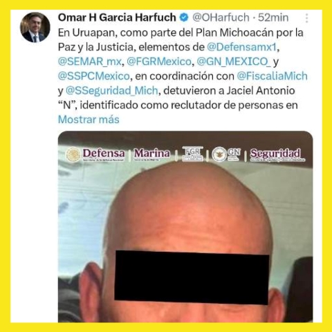 «En Uruapan, como parte del Plan Michoacán por la Paz y la Justicia, elementos de @Defensamx1, @SEMAR_mx, @FGRMexico, @GN_MEXICO_y @SSPCMexico, en coordinación con @FiscaliaMich y @SSeguridad_Mich, detuvieron a Jaciel Antonio “N”, identificado como reclutador de personas en centros de rehabilitación para integrarlas a células delictivas.