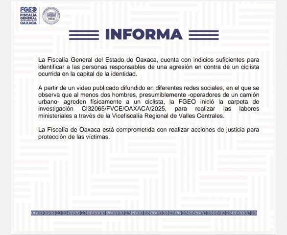 A partir de un video publicado difundido en diferentes redes sociales, en el que se observa que al menos dos hombres, presumiblemente -operadores de un camión urbano- agreden físicamente a un ciclista, la FGEO inició la carpeta de investigación CI32065/FVCE/OAXACA/2025, para realizar las labores ministeriales a través de la Vicefiscalía Regional de Valles Centrales.