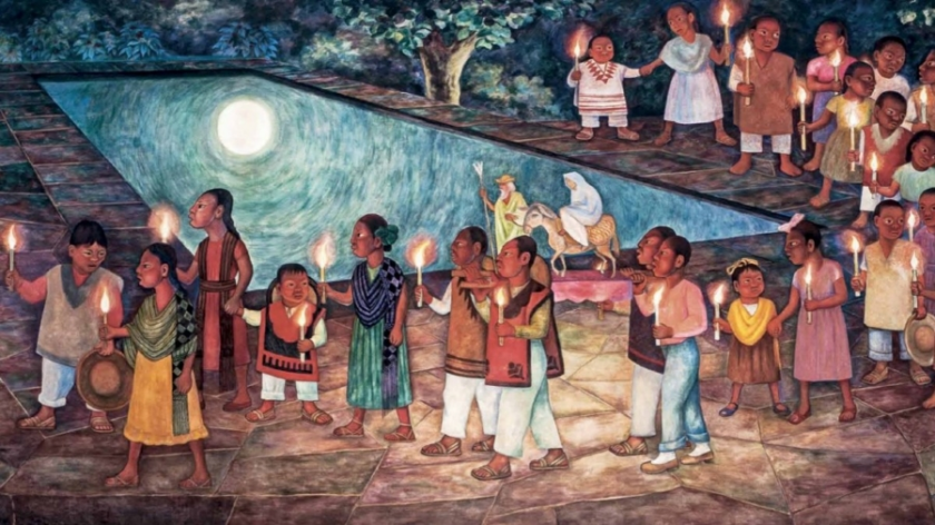 «Los Niños Pidiendo Posada» (1953): Esta emotiva obra muestra a un grupo de niños y niñas en procesión, con velas encendidas, recreando el pasaje bíblico de María y José buscando refugio. Rivera captura la inocencia y la devoción de la infancia, iluminando la escena con la luz de las velas, un elemento central del ritual de las posadas.