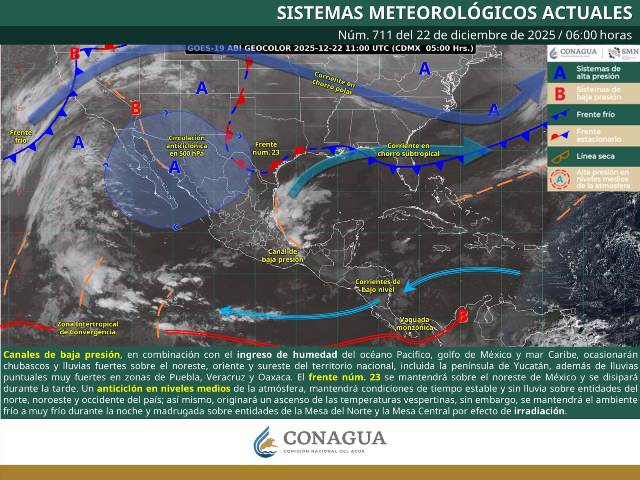 Este día, canales de baja presión sobre el noreste, oriente y sureste del territorio nacional, en combinación con el ingreso de humedad del océano Pacifico, golfo de México y mar Caribe, ocasionarán chubascos y lluvias fuertes en las regiones mencionadas, incluida la península de Yucatán, además de lluvias puntuales muy fuertes en zonas de Puebla, Veracruz y Oaxaca. Por otra parte, el frente núm. 23 se mantendrá sobre el noreste de México y se disipará durante la tarde. Finalmente, un anticiclón en niveles medios de la atmósfera, mantendrá condiciones de tiempo estable y sin lluvia sobre entidades del norte, noroeste y occidente del país; así mismo, originará un ascenso de las temperaturas vespertinas, sin embargo, se mantendrá el ambiente frío a muy frío durante la noche y madrugada sobre entidades de la Mesa del Norte y la Mesa Central por efecto de irradiación.