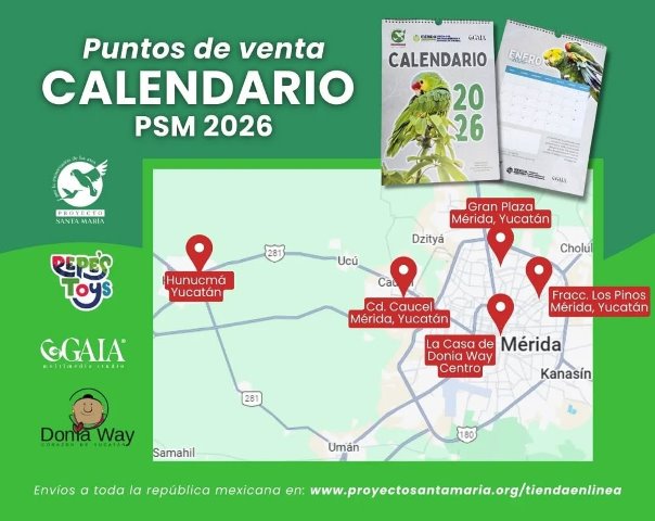 La tienda de artesanías «La Casa de Donia Way» y la tienda de artículos para mascotas «Pepe´s Toys», destacados promotores de la conservación de loros yucatecos, ya tienen a la venta el Calendario de Loros 2026 del Centro de Difusión y Conservación Ambiental Proyecto Santa María.