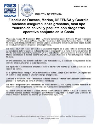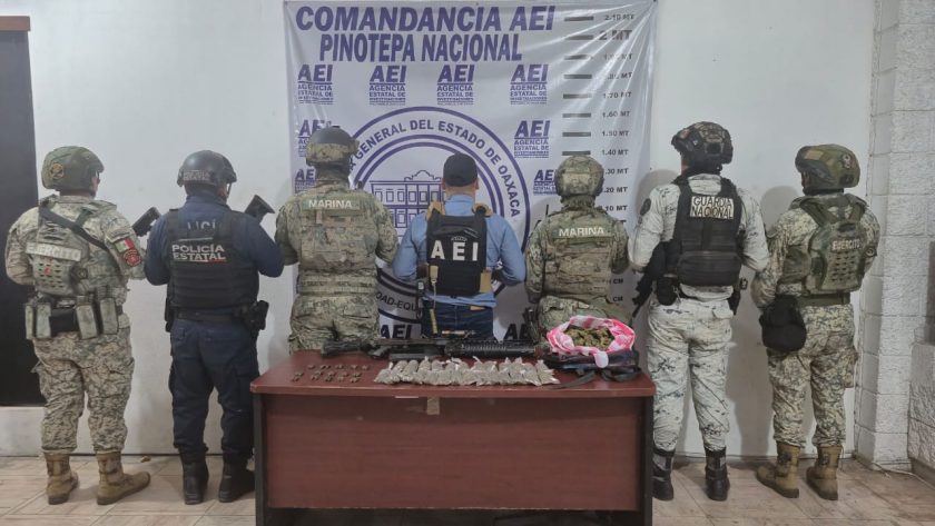 La Fiscalía General del Estado de Oaxaca (FGEO), en estrecha coordinación con la Secretaría de Marina (SEMAR) y con el apoyo de la Policía Municipal de Santiago Pinotepa Nacional, logró el aseguramiento de un arma de fuego de uso exclusivo del Ejército, así como drogas, durante un operativo interinstitucional realizado en la región Costa.