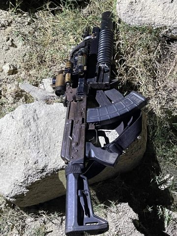 En el lugar se localizó y aseguró un fusil semiautomático calibre 7.62 tipo “cuerno de chivo”, un cargador con 30 cartuchos útiles, además de un aditamento tipo lanzagranadas.