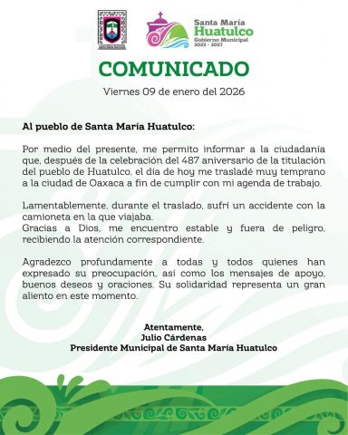El presidente municipal de Santa María Huatulco Julio Cárdenas Ortega, sufrió una volcadura al momento de trasladarse con destino a Oaxaca,, los hechos ocurrieron en el libramiento Ocotlán-Ejutla, en la ruta hacia la capital oaxaqueña.