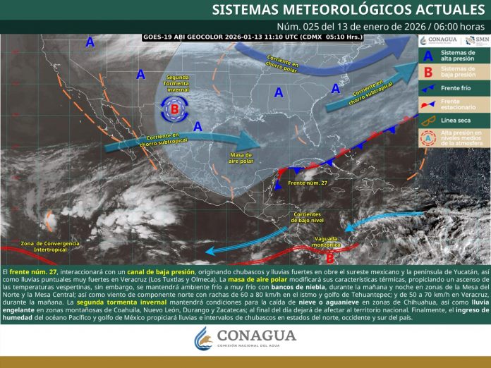 Este día, el frente núm. 27, interaccionará con un canal de baja presión sobre el sureste mexicano y la península de Yucatán, originando chubascos y lluvias fuertes en dichas regiones, así como lluvias puntuales muy fuertes en Veracruz (Los Tuxtlas y Olmeca). Por otra parte, la masa de aire polar asociada al frente modificará gradualmente sus características térmicas, propiciando un ascenso de las temperaturas vespertinas, sin embargo, se mantendrá ambiente frío a muy frío durante la mañana y noche sobre entidades de la Mesa del Norte y la Mesa Central, con bancos de niebla en Xalapa, Ciudad de México, Tecámac, Chihuahua, Culiacán, Toluca, Pachuca, Tuxtla Gutiérrez, Durango, Monterrey, así como en zonas montañosas de Durango, Chihuahua, Coahuila, Zacatecas, San Luis Potosí, Hidalgo, Querétaro, Puebla, Veracruz, Oaxaca y Chiapas; además de viento de componente norte con rachas de 60 a 80 km/h en el istmo y golfo de Tehuantepec; y de 50 a 70 km/h en Veracruz, durante la mañana. Se prevé que el frente se disipe en el oriente del golfo de México durante la madrugada del miércoles. A su vez, la segunda tormenta invernal de la temporada mantendrá condiciones para la caída de nieve o aguanieve en zonas de Chihuahua, así como lluvia engelante en zonas montañosas de Coahuila, Nuevo León, Durango y Zacatecas; al final del día, se desplazará hacia el sur de Estados Unidos, dejando de afectar al territorio nacional. Finalmente, el ingreso de humedad del océano Pacífico y golfo de México propiciará lluvias e intervalos de chubascos en estados del norte, occidente y sur del país.
