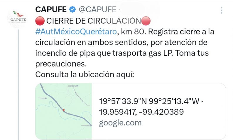 Se registró una explosión de una pipa con gas LP en el kilómetro 80 de la autopista México-Querétaro, el incidente ocurrió en el tramo ubicado entre Jilotepec y Tepeji del Río.