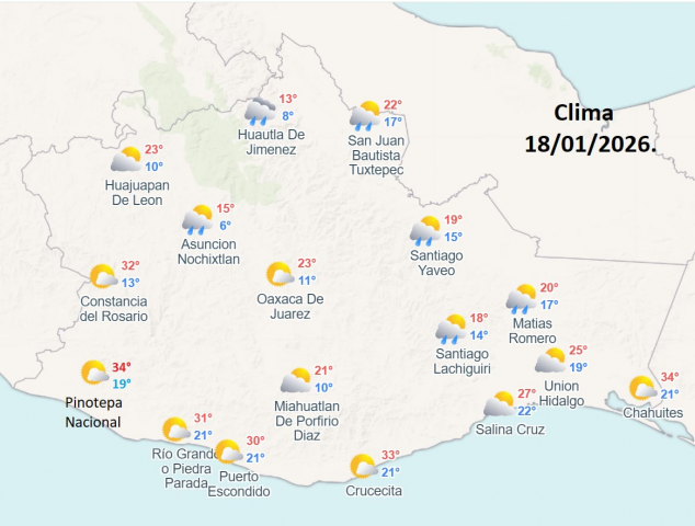 Para el Pacífico Sur en el transcurso del día, cielo nublado en la mayor parte de la región. Por la mañana, ambiente templado a fresco, y frío a muy frío en sierras de la región, y cálido en las costas. Posibilidad de chubascos matutinos en zonas de Oaxaca y Chiapas. Durante la tarde, ambiente cálido, siendo caluroso en costas, y templado a fresco en sierras de Oaxaca y Chiapas; probabilidad de lluvias puntuales intensas en Oaxaca y Chiapas, las cuales podrían originar incremento en los niveles de ríos y arroyos, deslaves, encharcamientos e inundaciones; además de chubascos en Guerrero. Evento de “Norte” de 70 a 90 km/h con rachas de 100 a 120 km/h en el istmo y golfo de Tehuantepec (Oaxaca y Chiapas), así como viento de dirección variable de 10 a 20 km/h en el resto de la región, con rachas de 30 a 50 km/h en zonas de Guerrero. Oleaje de 4.0 a 5.0 metros de altura en el golfo de Tehuantepec.