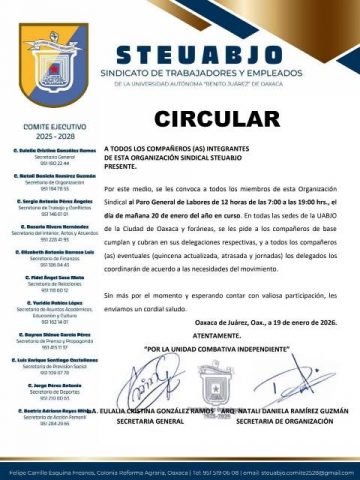 De acuerdo con la circular  emitida por la dirigencia sindical de la STEUABJO, el paro  de labores de 12 horas iniciará formalmente a las 07:00 horas y concluirá a las 19:00 horas de este martes 20 de enero del año en curso en todas las sedes de la UABJO en el estado.