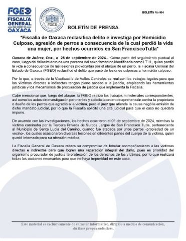 Por parte de la Fiscalía General del Estado de Oaxaca, el 28 de septiembre emitió el siguiente comunicado