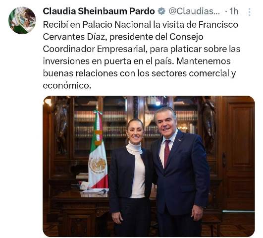 A través de su cuenta en X, la presidente Claudia Sheinbaum Pardo, informó que se reunió con Francisco Cervantes Díaz, presidente del Consejo Coordinador Empresarial, para platicar de las próximas inversiones en el país.