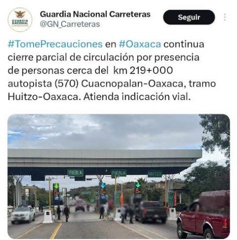#TomePrecauciones en #Oaxaca continua cierre parcial de circulación por presencia de personas cerca del km 219+000 autopista (570) Cuacnopalan-Oaxaca, tramo Huitzo-Oaxaca. Atienda indicación vial. pic.twitter.com/0dgfJVn2NJ