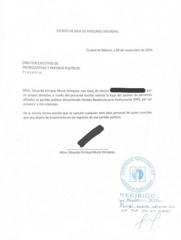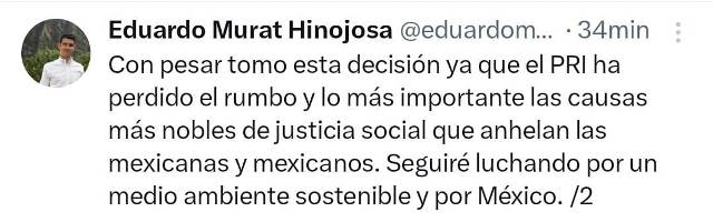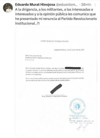 A través de su cuenta en X, Eduardo Murat Hinojosa, informó que presentó su renuncia al Partido Revolucionario Institucional (PRI).