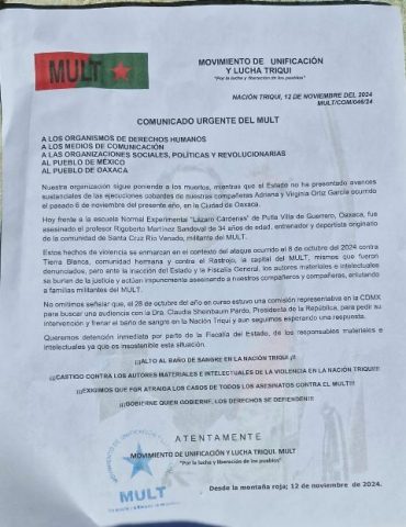 Ante los hechos ocurridos integrantes del Movimiento de Unificación y Lucha Triqui (MULT)  protestaron frente de Palacio de Gobierno, pidiendo justicia por asesinato del profesor y la presentación con vida de sus compañeros ya que desde el momento de su fundación de su organización tiene  5 desaparecidos y más de 500 compañeros caídos, exigen al gobierno federal que voltee a ver al estado ya que tienen la esperanza porque hay una mujer presidenta y que haga justicia.