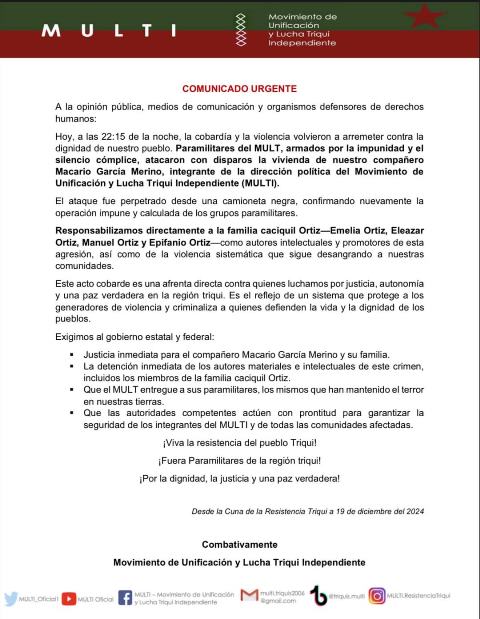 SEGURIDAD - POLICIACA COMUNICADO DEL MULT social 20 de diciembre de 2024 1 min de lectura Imagen 20 de diciembre de 2024 Tags: COMUNICADO MEXICO MULT NOTICIAS OAXACA Post navigation Anterior Protestan trabajadores del Citybus por falta de prestaciones y por el pago de aguinaldo con forme a la leySiguiente SAT brindará atención a los contribuyentes en periodo vacacional Deja una respuesta Cancelar la respuestaLo siento, debes estar conectado para publicar un comentario. Más historias 2 min de lectura SEGURIDAD - POLICIACA Fiscalía de Oaxaca realiza cateo en la Colonia Monte Albán: desarticula célula delictiva dedicada a venta y distribución de drogas en San Martín Mexicapan 15 de octubre de 2025 social 2 min de lectura SEGURIDAD - POLICIACA Fiscalía de Oaxaca detiene a una persona e identifica a responsables por homicidio y abandono del cuerpo de la víctima en calles de la Colonia Jardín 15 de octubre de 2025 social 2 min de lectura SEGURIDAD - POLICIACA Fiscalía de Oaxaca detiene a objetivo prioritario A.O.S. alias “Choco Rol”, operaba grupo delictivo en los límites de la Costa con Guerrero 15 de octubre de 2025 social