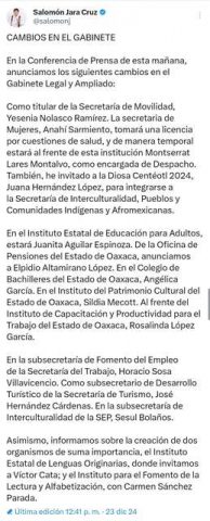 A través de su cuenta de X, el gobernador Salomón Jara anuncio cambios en el Gabinete Legal y Ampliado, en un tuit informo que en conferencia de prensa de este lunes se dieron a conocer los siguientes cambios
