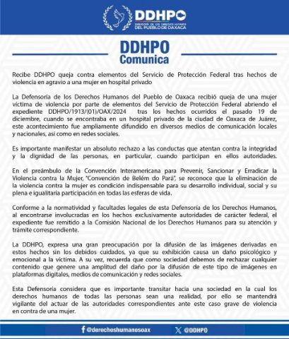 SEGURIDAD - POLICIACA COMUNICADO DE PRENSA DDHPO social 27 de diciembre de 2024 Tras los hechos registrados en agravio a una mujer en un hospital privado de Oaxaca Tags: COMUNICADO DDHPO HOSPITAL MEXICO MUJER NOTICIAS OAXACA Post navigation Anterior Fiscalía de Oaxaca realiza cateo en la Sierra Sur; asegura armas de fuego y un vehículo desmantelado con reporte de roboSiguiente Comprueban pérdida de manglares en México con uso de Google Earth Engine Deja una respuesta Cancelar la respuestaLo siento, debes estar conectado para publicar un comentario. Más historias 2 min de lectura SEGURIDAD - POLICIACA Fiscalía de Oaxaca realiza cateo en la Colonia Monte Albán: desarticula célula delictiva dedicada a venta y distribución de drogas en San Martín Mexicapan 15 de octubre de 2025 social 2 min de lectura SEGURIDAD - POLICIACA Fiscalía de Oaxaca detiene a una persona e identifica a responsables por homicidio y abandono del cuerpo de la víctima en calles de la Colonia Jardín 15 de octubre de 2025 social 2 min de lectura SEGURIDAD - POLICIACA Fiscalía de Oaxaca detiene a objetivo prioritario A.O.S. alias “Choco Rol”, operaba grupo delictivo en los límites de la Costa con Guerrero 15 de octubre de 2025 social