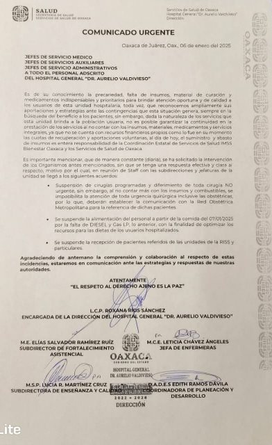 Mediante un oficio que comenzó a circular el día lunes la dirección del hospital civil «Dr. Aurelio Valdivieso» en el estado de Oaxaca, informó la falta de insumos y recursos para su atención, suspenden cirugías programadas, urgencias obstétricas y servicio de comedor para el personal.