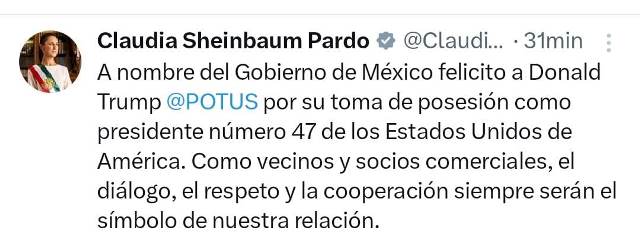 A través de su cuenta en X (Twitter) la presidenta Claudia Sheinbaum felicitó a Donald Trump por su toma de posesión de los Estados Unidos de América.