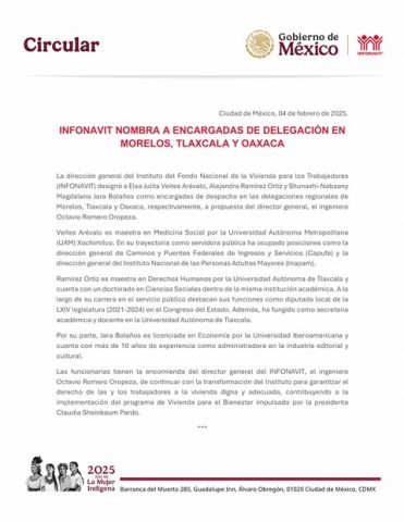 A través de un comunicado el Infonavit, informó quienes serán las encargadas del despacho en las delegaciones regionales de Morelos, Tlaxcala y Oaxaca, respectivamente.