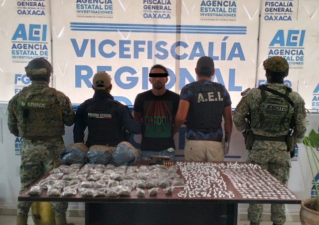 Como parte de las acciones para garantizar la paz social y seguridad en todas las regiones de la entidad, la Fiscalía General del Estado de Oaxaca (FGEO), a través de elementos de la Agencia Estatal de Investigaciones (AEI), en colaboración con la Secretaría de la Defensa Nacional (DEFENSA), Secretaría de Marina, Policía Estatal y Policía Vial, lograron la detención de una persona del sexo masculino identificado como R.E.P.R., por el delito Contra la Salud cometido en la región de la Costa.