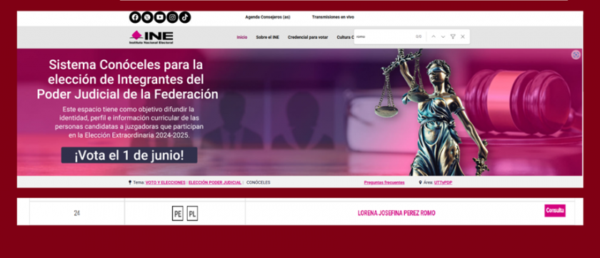 Por lo que, dados los resultados que se han presentado en este singular proceso de elección de juristas interesados en ocupar un espacio de impartición de justicia, las redes sociales ha sido su herramienta de difusión y campaña, siendo el lema de Lorena Josefina Pérez Romo, “24 horas contigo”, tal y como se puede apreciar en las publicaciones que ha realizado y que se pueden escuchar para conocer mejor a las candidata 24 del listado para Ministra de la Suprema Corte de la Nación.