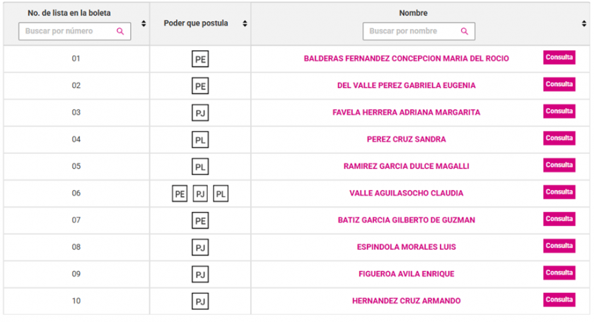 Como en los demás casos, las boletas cuentan con numeración secuencial que acompaña a cada nombre las y los candidatos que aspiran a ocupar una de las dos magistraturas disponibles, número que se emitirá en la boleta el día de la elección el próximo 1 de junio de 2025, que de la consulta de la página del INE (https://candidaturaspoderjudicial.ine.mx/), el listado se conforma por las siguientes personas.
